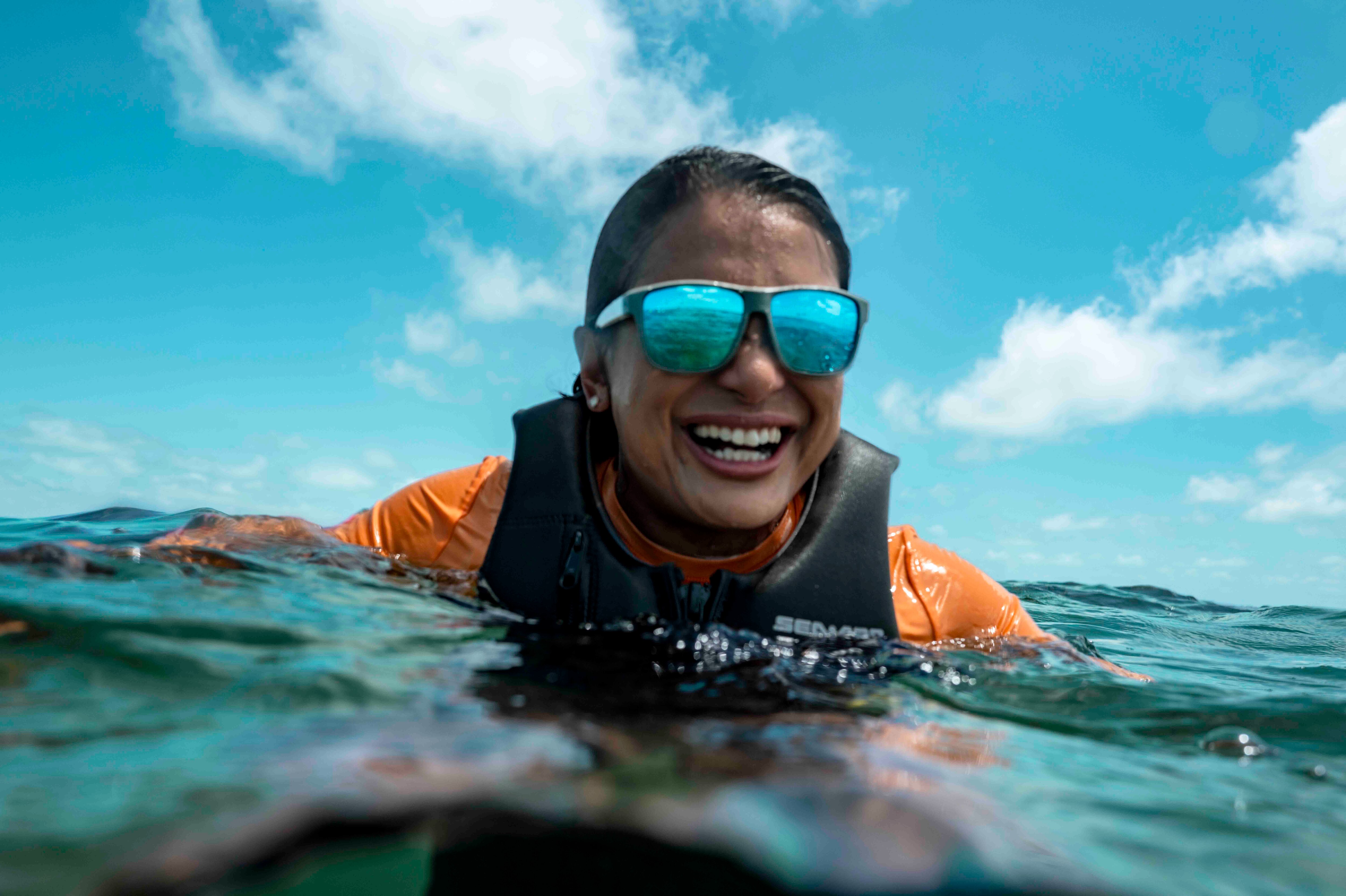 A man wearing polarized sunglasses in the water with two Sea-Doo personal watercraft behind him, with a woman sitting on one of it